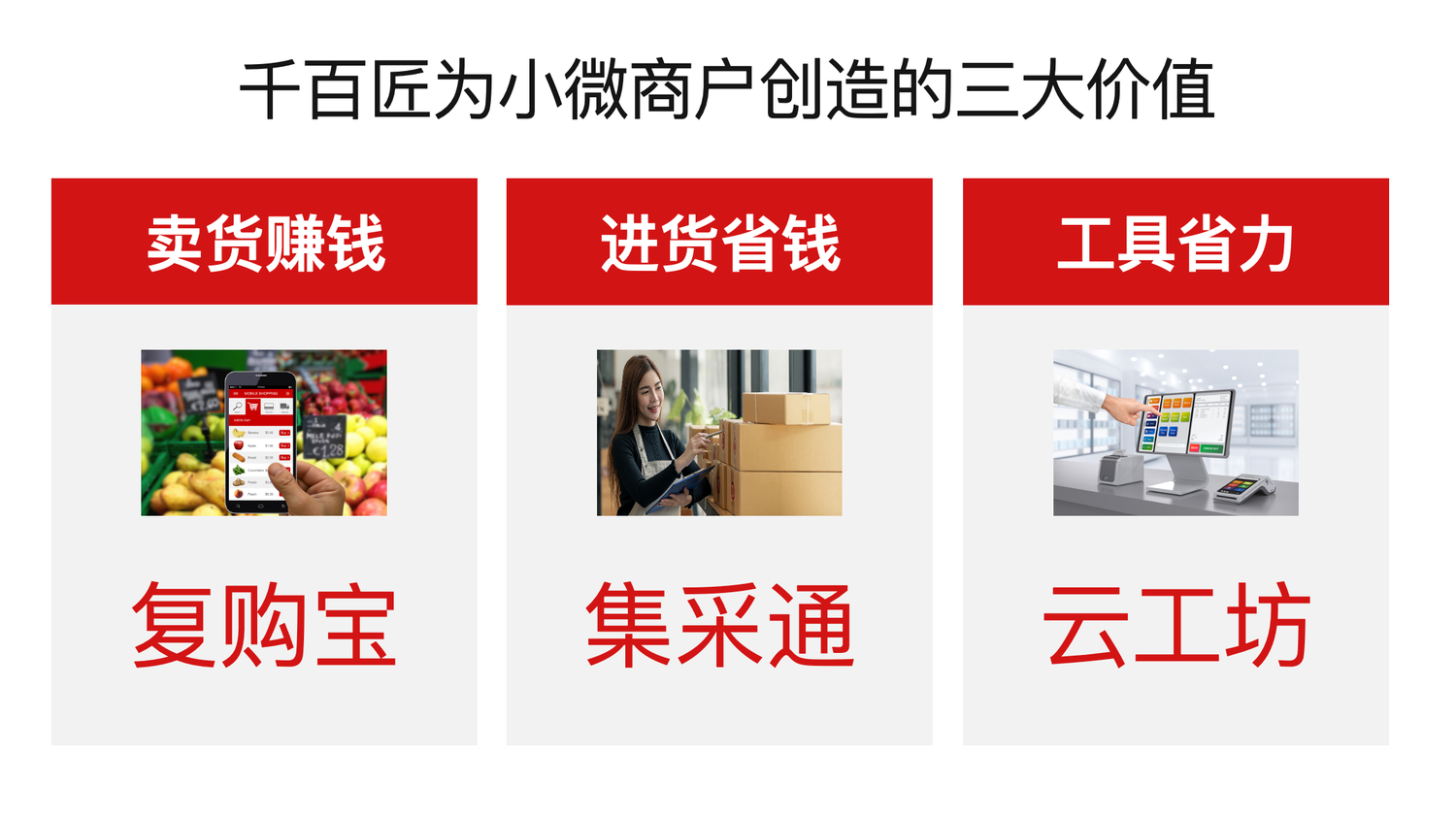 实战应用场景 场景一:县城母婴用品店 店主:王女士,熟悉各类母婴产品,但不懂电脑。 使用前:手写记账,依赖销售员通知活动,顾客多为邻里。 使用后:通过一键直采,拿到大牌奶粉区域首发资格和更优价格。利用会员功能建立顾客档案,系统智能提醒精准推荐(如宝宝该换尿不湿尺码)。每周三在妈妈群发起 “秒杀活动”,线上订单远超线下。 场景二:乡镇路口便利店 店主:李大哥,小店位置好,但面临大型连锁便利店竞争。 使用前:商品摆放杂乱,月底盘点糊涂,收入来源单一。 使用后:销售热力图显示,年轻人购买气泡水和无糖茶的频率很高。他据此调整货架,引进网红品牌,小店变 “潮”。开通邻里配送,服务不愿下楼的年轻人,夜间外卖订单成为新增长点。通过千百匠加入区域饮料品牌联合采购,进货价比连锁店还低。 通过展现千百匠在市场上的真实价值我们展示的,不只是一个 App,更是: 一个连接器:向上链接高效透明的产业供应链,向下链接中国最广大的线下零售终端。 一个翻译器:将复杂的云计算、大数据、人工智能,翻译成店主能听懂的 “补货提醒” 和能用上的 “促销海报”。 一个放大器:放大每一个平凡小店的潜能,让他们在数字经济浪潮中,不仅能活下去,更能活得好。 我们连接的,不仅是商品与数据,更是千千万万个奋斗者的生意与梦想。 欢迎加入千百匠,共同开启中国县域商业的数字化新未来!